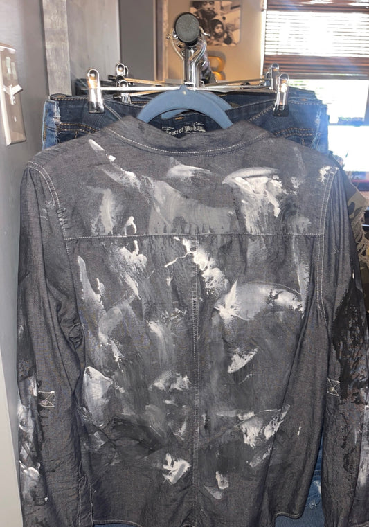 BLACK WHITE AND SILVER HAND PAINTED DENIM SHIRT