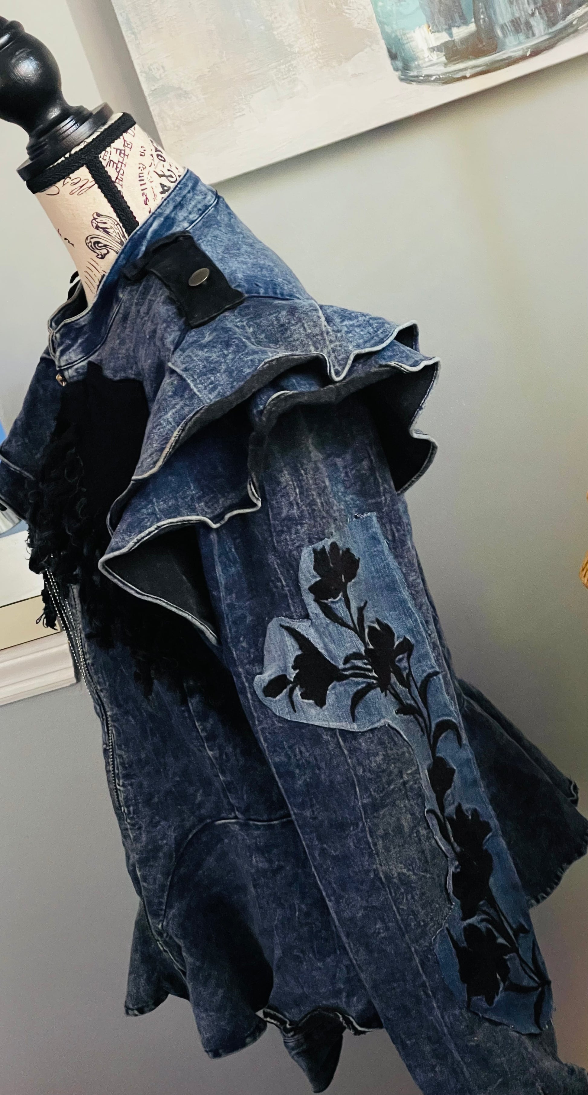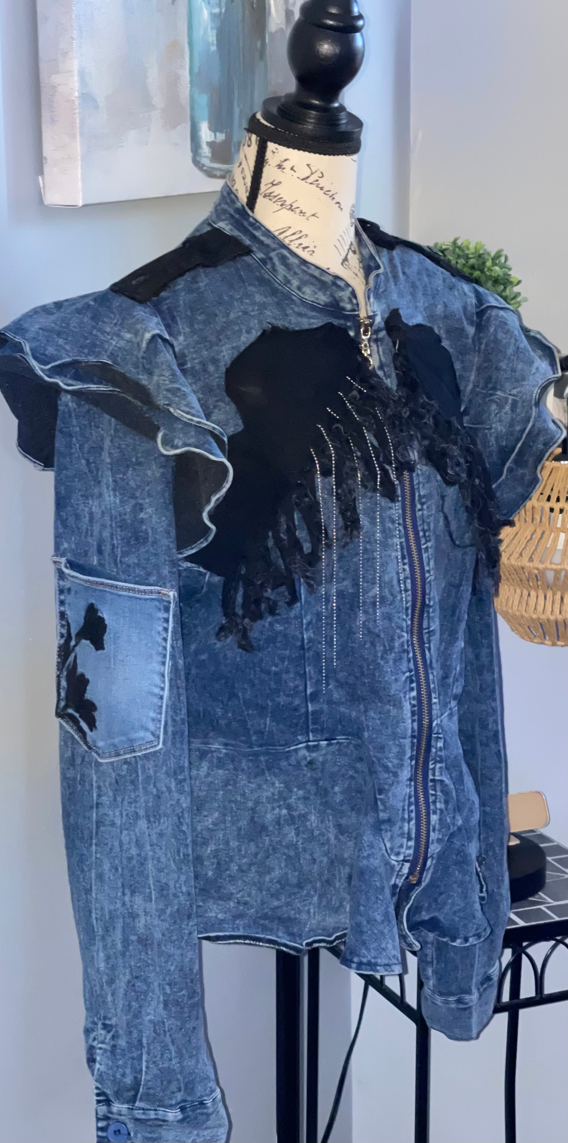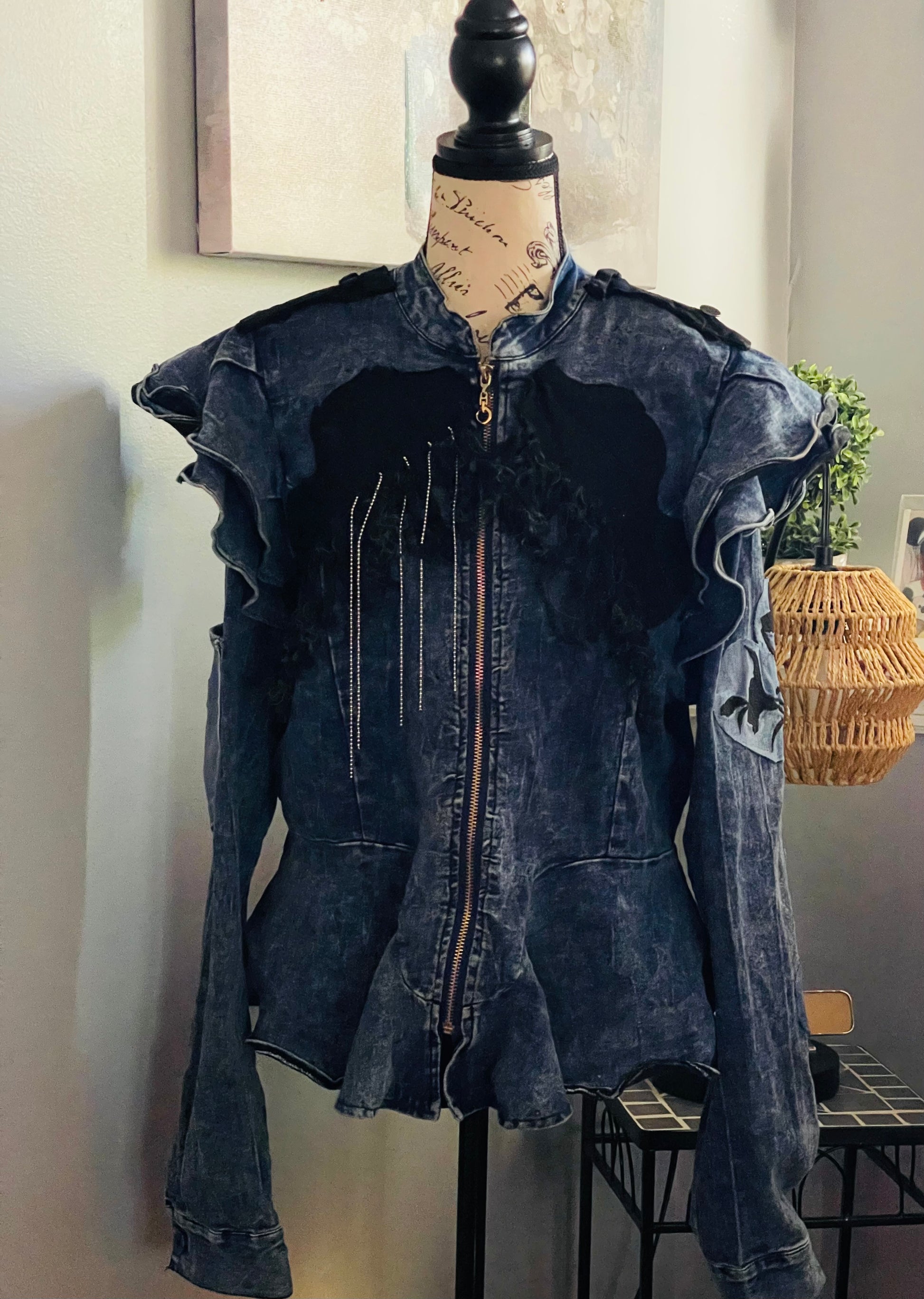 CHAIN ACCENT DENIM RUFFLE JACKET